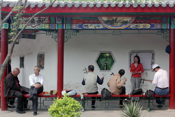 | 唱戏的比看戏的多,两个戏迷神态各异,唱的、伴奏的进入角色,真个自得其乐,有意思。