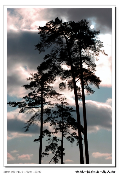 当时,太阳刚从云彩中露出,很难的瞬间。(美人松映在逆光的云朵上,太阳刚刚露头。)