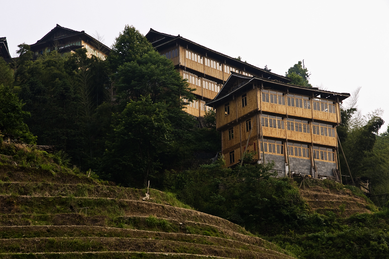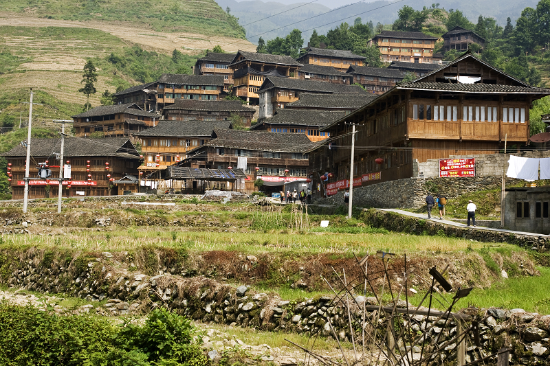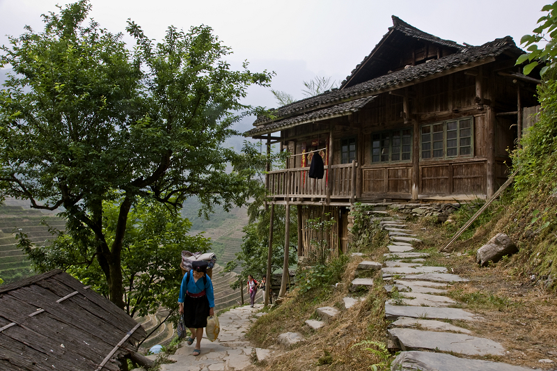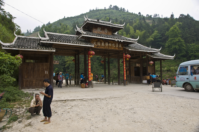 龙脊梯田距龙胜县城22公里,距桂林市区103公里,景区面积共66平方公里,梯田分布在海拔300至1100米之间,坡度大多在26至35度之间,最大坡度达50度。从山脚盘绕到山顶,小山如螺,大山似塔,层层叠叠,高低错落。从高处望去,梯田的优美曲线一条条、一根根、或平行或交叉,蜿蜒如春螺、披岚似云塔,显示了动人心魄的曲线美。其线条行云流水,潇洒柔畅;其规模磅礴壮观,气势恢弘,有“梯田世界之冠”的美誉龙脊梯田只是一个景区统称,包含龙脊寨(壮族)、平安寨(壮族)、中六寨(瑶族)、大寨(瑶族)、田头寨(瑶族)、小寨(瑶族)等若干村寨。就梯田本身而言,最壮观的是大寨的金坑梯田和附近的小寨梯田。(这一段是搜来的) 我们在平安寨住了一天,在田头寨住了两天。三层的木楼,有独立卫生间,随时可以洗澡,环境挺干净,居民很友好,印象最深的是有好几次原住民和你走对面他(她)会主动向你打招呼说:你好!想给她们照张相,也不会遭到反对,只是会不好意思的说:(我 )不好看。假如在哪里多住上一段时间一定会是个不错的假期。