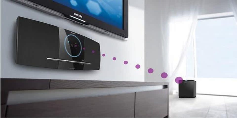 其實市面上不少5.1組合都採用無線傳音技術,但多數只應用在後置喇叭上,前、中置仍要自己慢慢駁,所以一些怕麻煩的影音迷就寧願選擇較簡約的2.1組合,而MCD388更將接駁系統進一步簡化,引進無線超低音傳音功能,只需駁上電源,主機就能以2.4GHz無線技術將音訊傳至超低音喇叭,不用慢慢調節頻道或選台,非常簡單,加上免卻了拉線的麻煩,可以將主機放入電視櫃,然後把超低音喇叭放在遠離主機的廳角位置都冇問題,靈活性一流